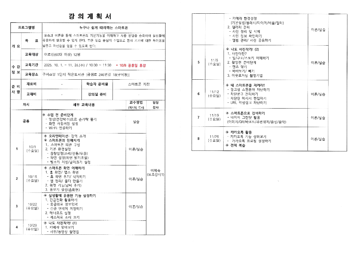 교육시간 | 10. 1. ~ 11. 26.(수) 10:30~11:30 |