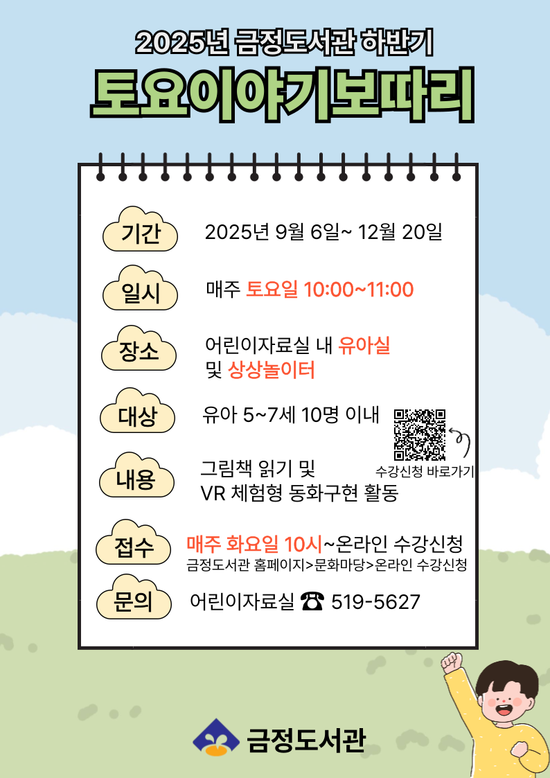 | 2025년 금정도서관 『토요이야기보따리』 수강신청 기 간: 2025. 9. 6. ~ 12. 20. 일 시: 매주 토요일 10:00~11:00 장 소: 금정도서관 1층 어린이자료실 내 유아실 및 상상놀이터 대 상: 5세~7세(2019 ~ 2021년생) 어린이 10명 ※대상자 불일치시 무통보 취소될 수 있습니다. 내 용: 친구들과 함께 그림책 읽고 만들기, 종이접기 등 독후활동 진행, 상상놀이터 디지털 체험 접 수: 매주 화요일 10시~ 온라인 수강신청 문 의: 051-519-5627 |