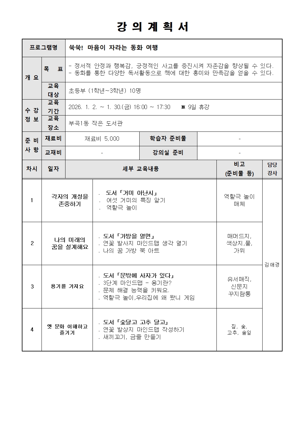 | [방학특강/부곡1동] 쑥쑥! 마음이 자라는 동화 여행 | |