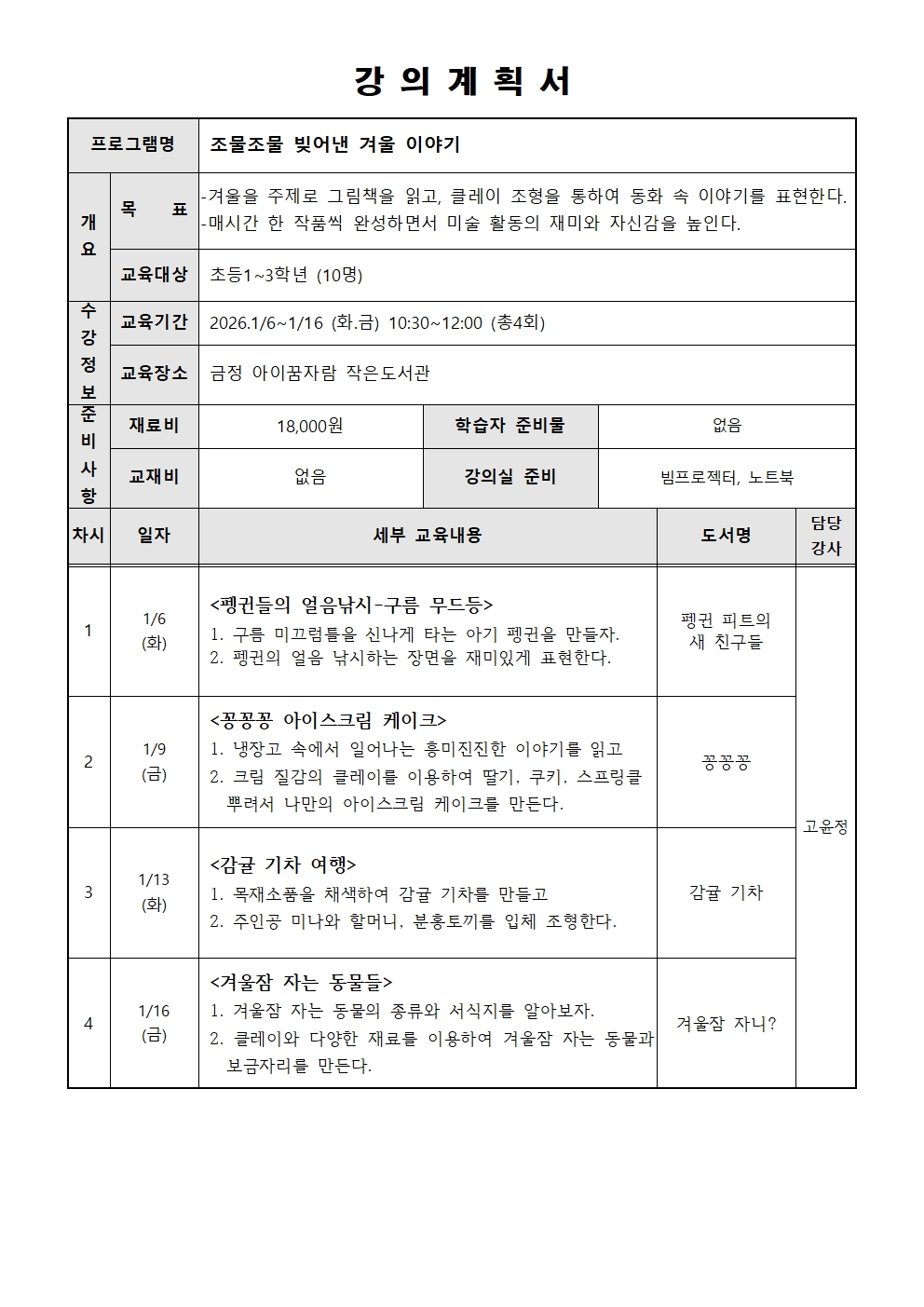 | [방학특강/금정아이꿈자람] 조물조물 빚어낸 겨울 이야기 | |
