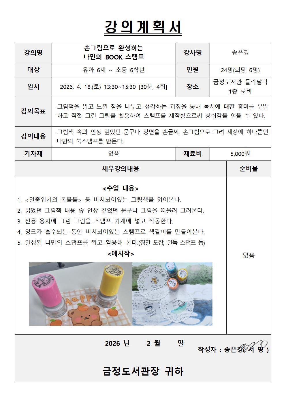 | [도서관주간] ①손그림으로 완성하는 나만의 BOOK 스탬프 만들기 체험(13:30~14:00) | |